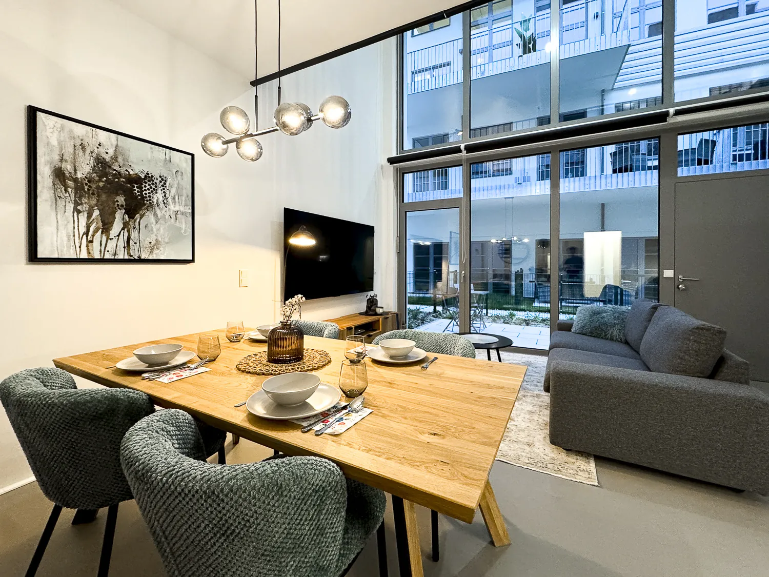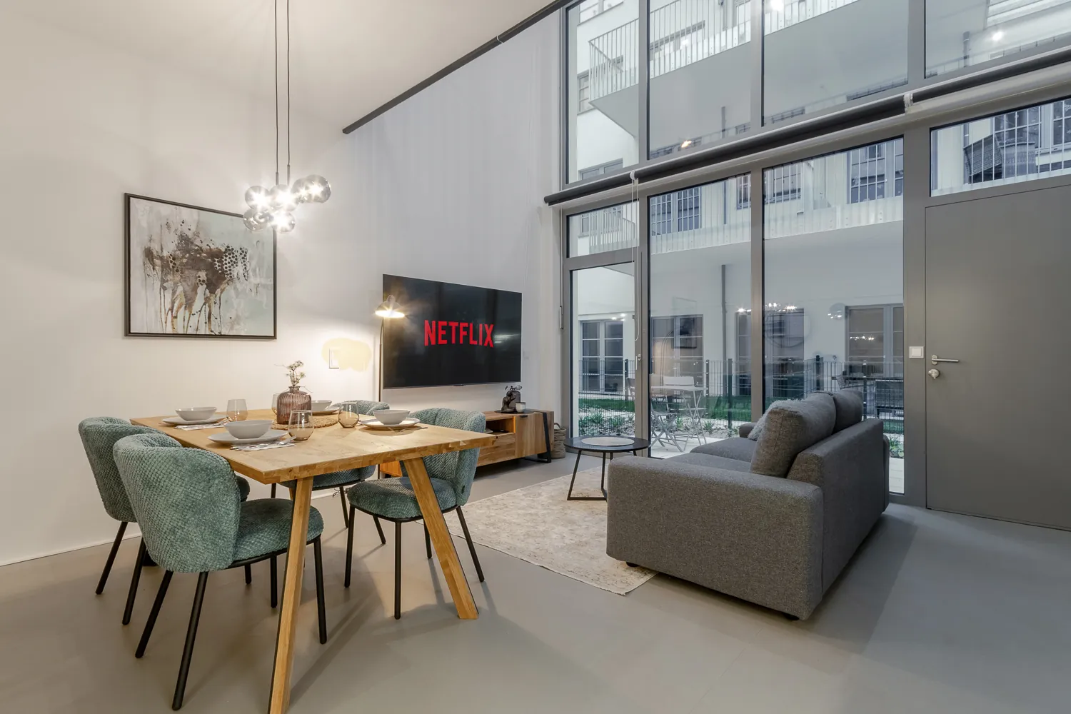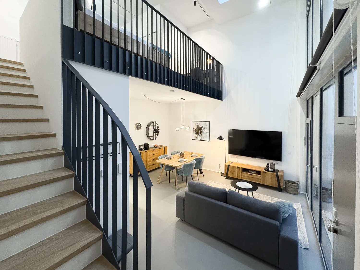 Open-plan living on two levels. The ground floor features a living area with a 75-inch Smart TV, dining table for 4, a fully equipped kitchen (oven, fridge, Nespresso) and a modern walk-in shower bathroom. The upper gallery holds a comfortable 180×200 cm double bed with a dedicated workspace overlooking the living area below — a true Bauhaus layout with double-height ceilings and floor-to-ceiling windows opening onto your private courtyard garden.