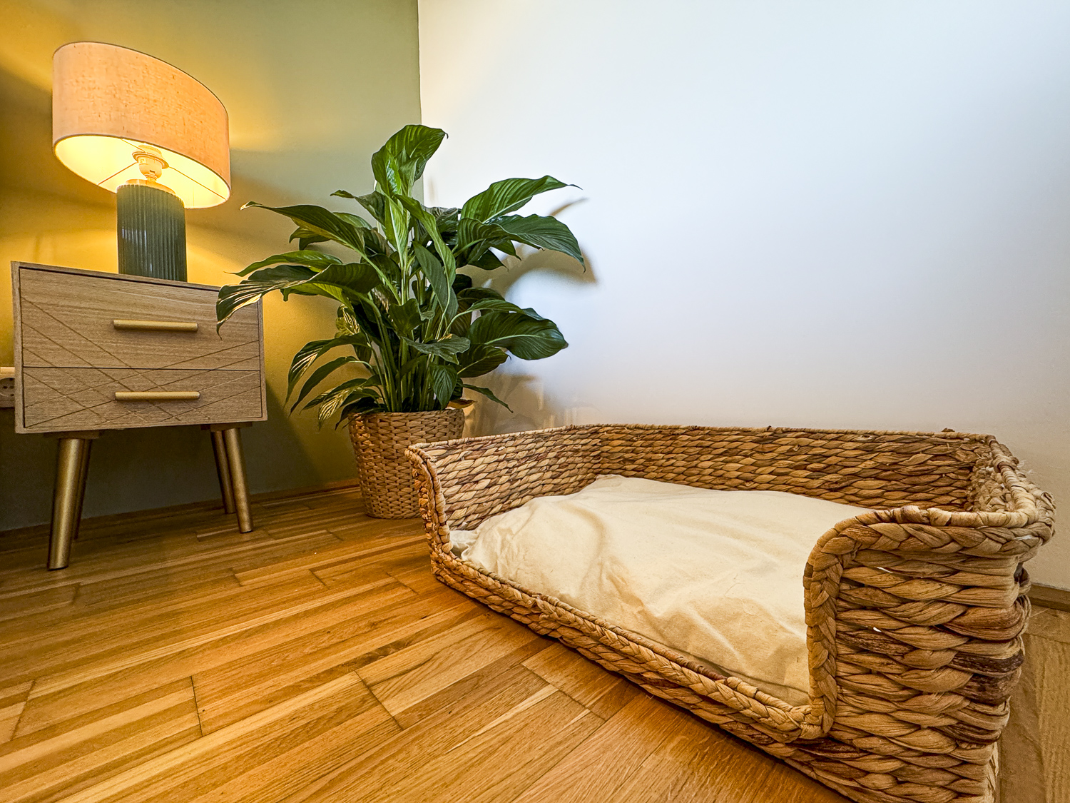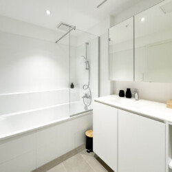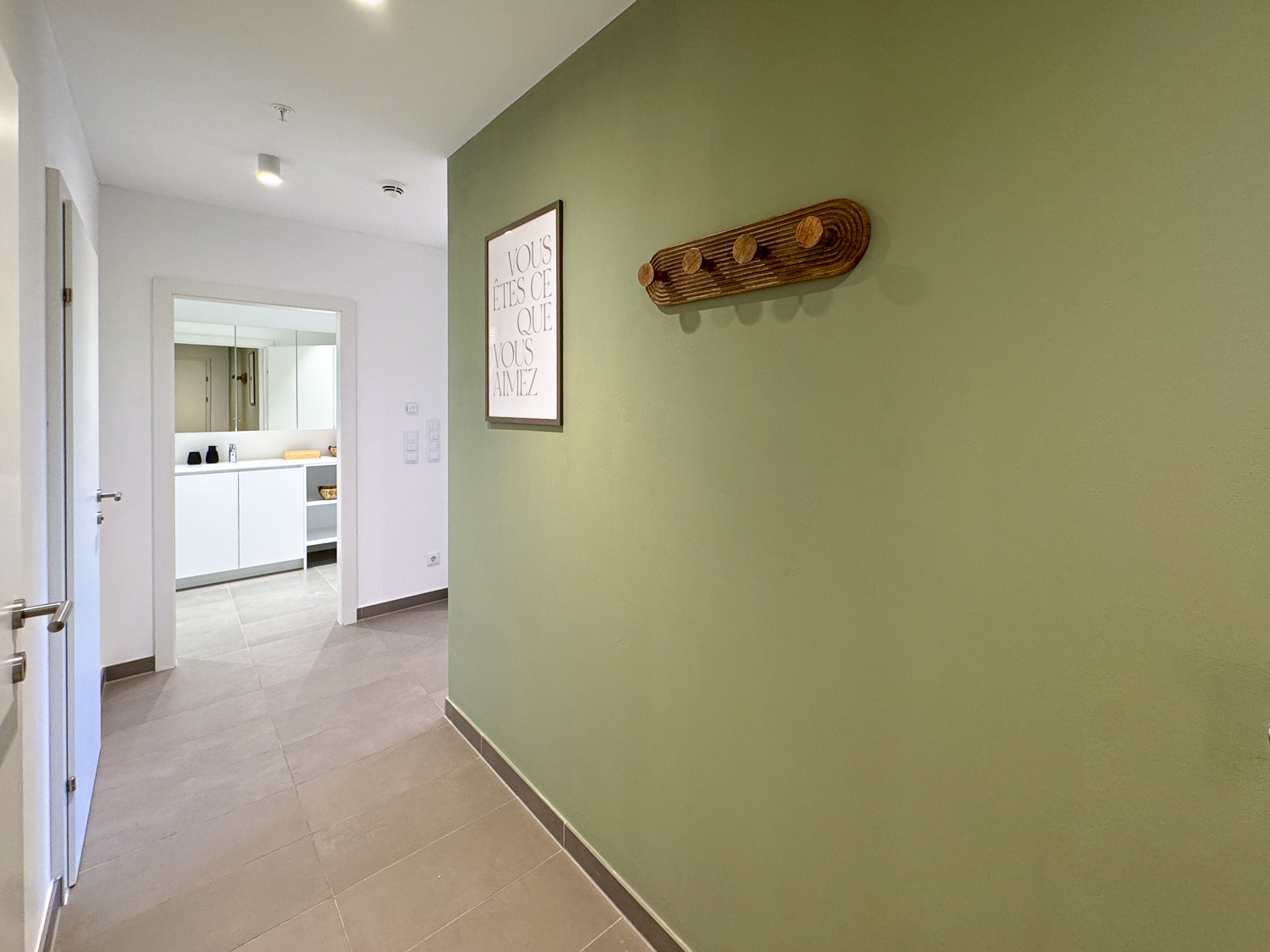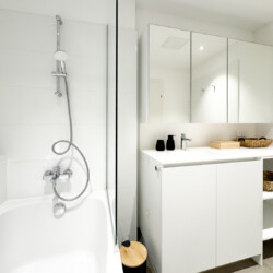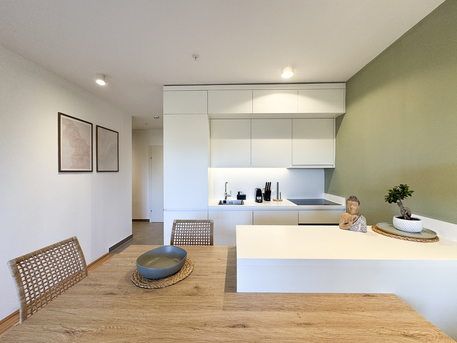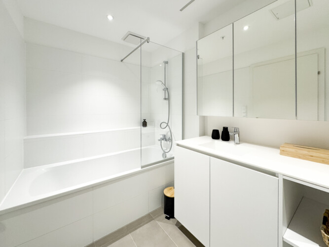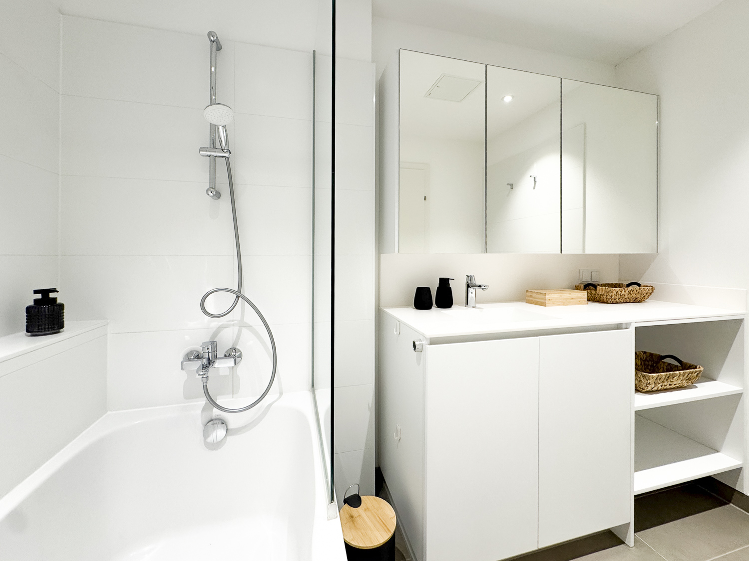 The fully equipped kitchen has everything you need: an induction cooktop, dishwasher, microwave, coffee maker, kettle, and toaster. The modern bathroom features a full-size bathtub — perfect for unwinding. Additional comforts include a washing machine, iron, hair dryer, and air conditioning.