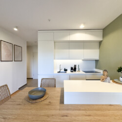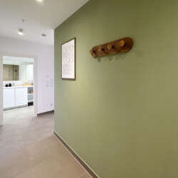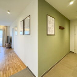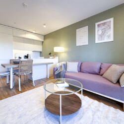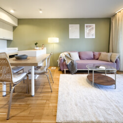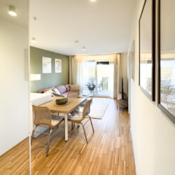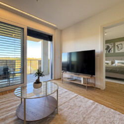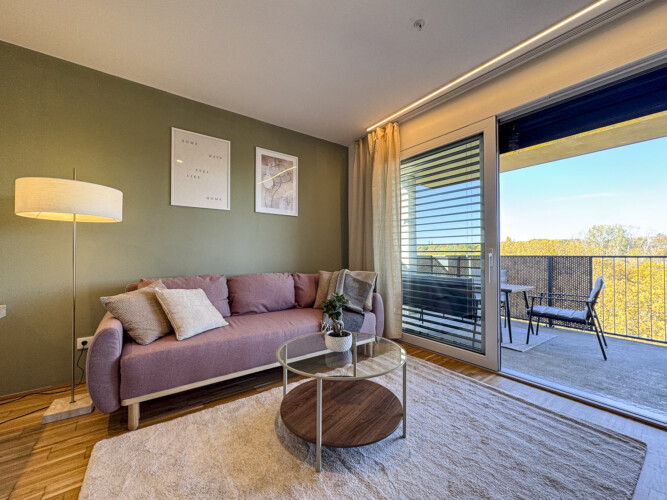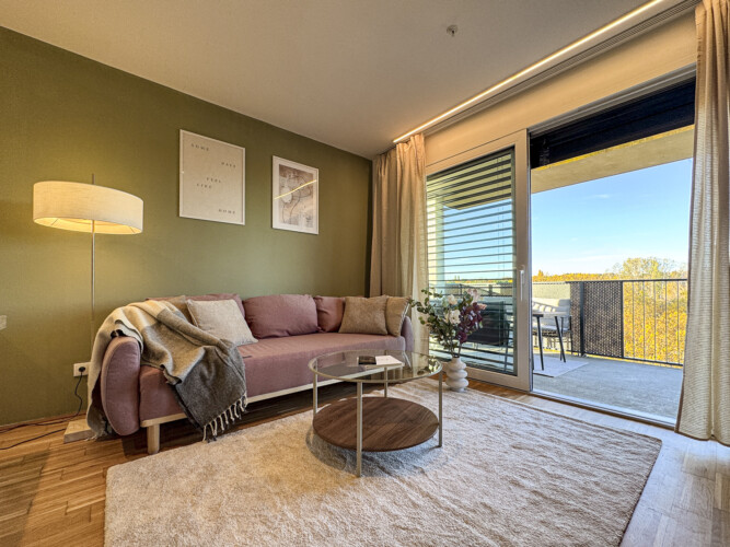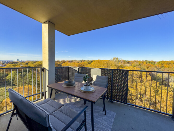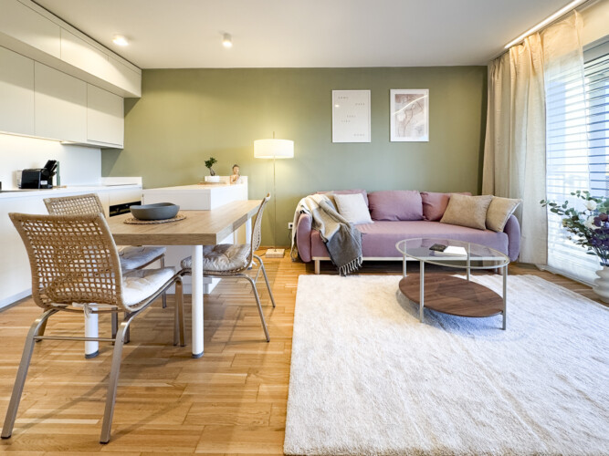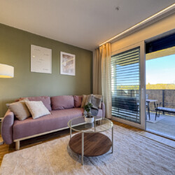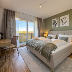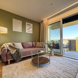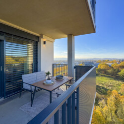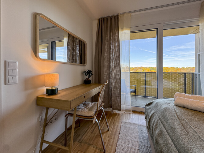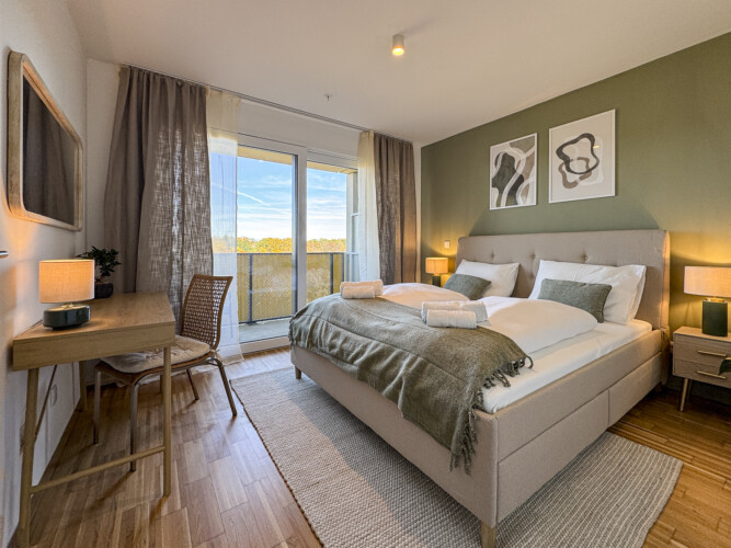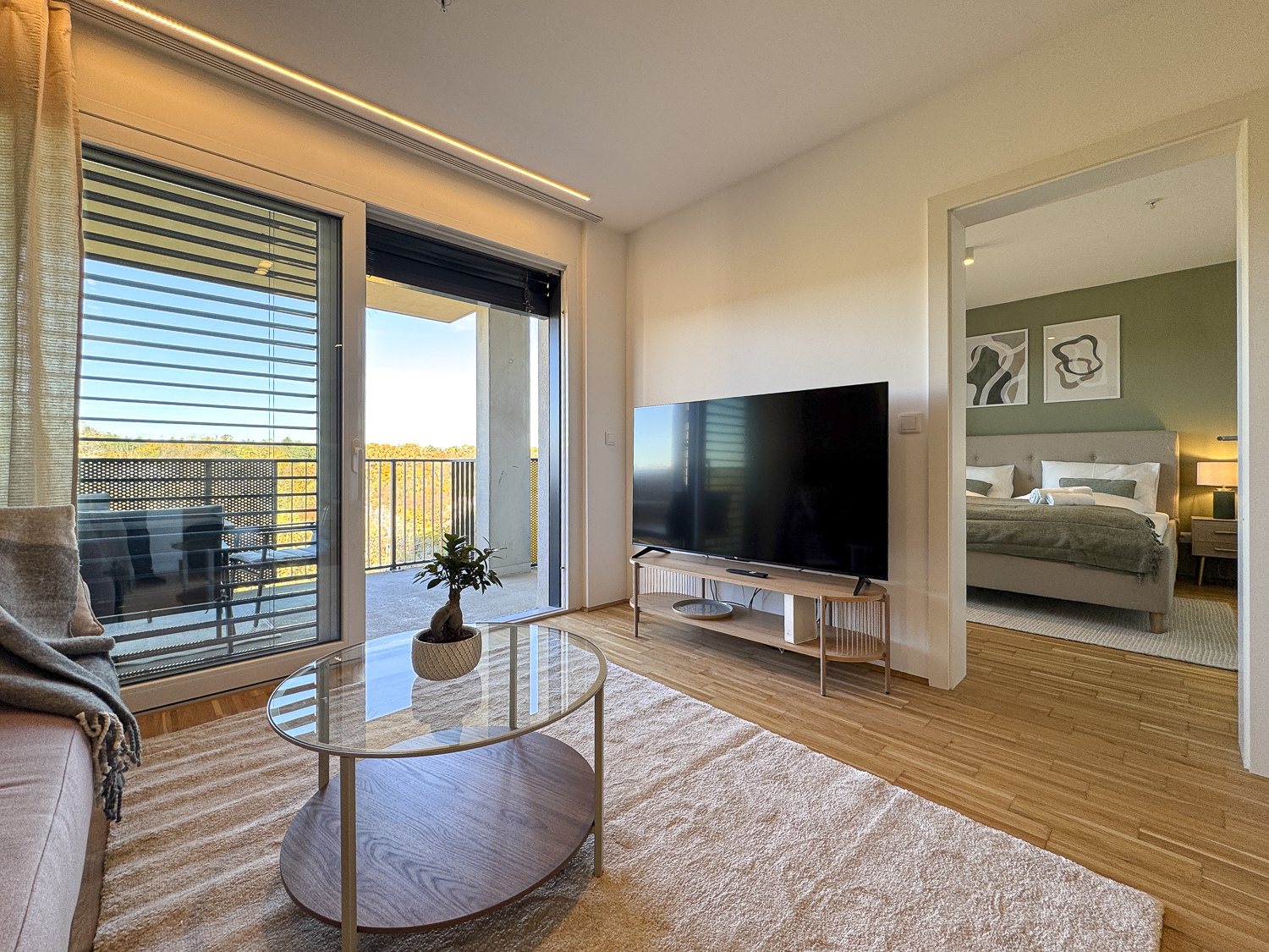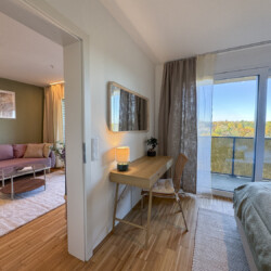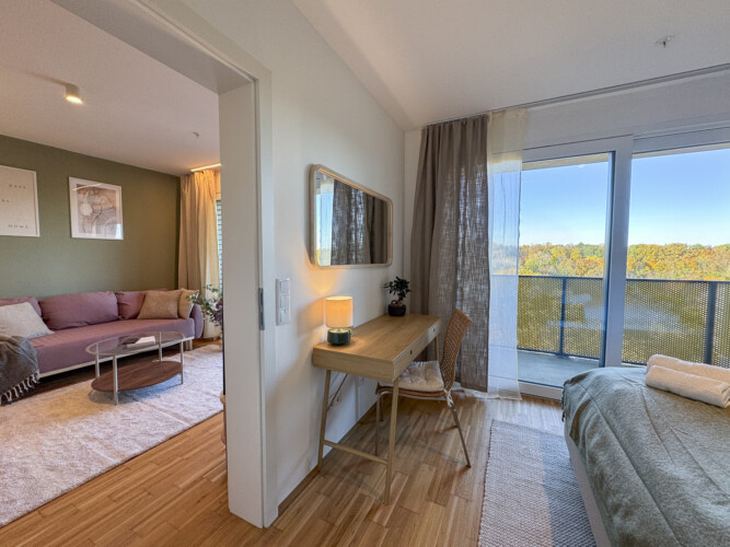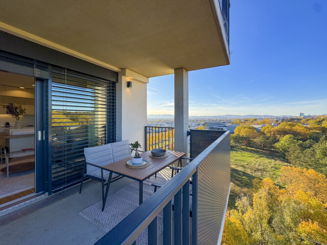 This modern apartment on the 9th floor welcomes up to 2 guests. The separate bedroom features a comfortable double bed with quality linens. The bright living area includes a cozy sofa, a large Smart TV with Disney Plus, and a dining area. Floor-to-ceiling windows offer breathtaking panoramic views over Kurpark Oberlaa and Vienna’s skyline.